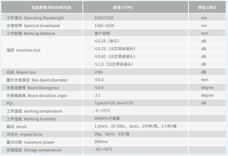低插入損耗:?jiǎn)卫w型(≤0.2dB),雙纖型(≤0.35dB) 高回波損耗:>55dB(最高可達(dá)70dB) 性能穩(wěn)定可靠,符合GR-1209-CORE和GR-1221-CORE標(biāo)準(zhǔn)產(chǎn)品結(jié)構(gòu)緊湊,尺寸可根據(jù)需求定制產(chǎn)品使用材料符合最新RoHS要求。