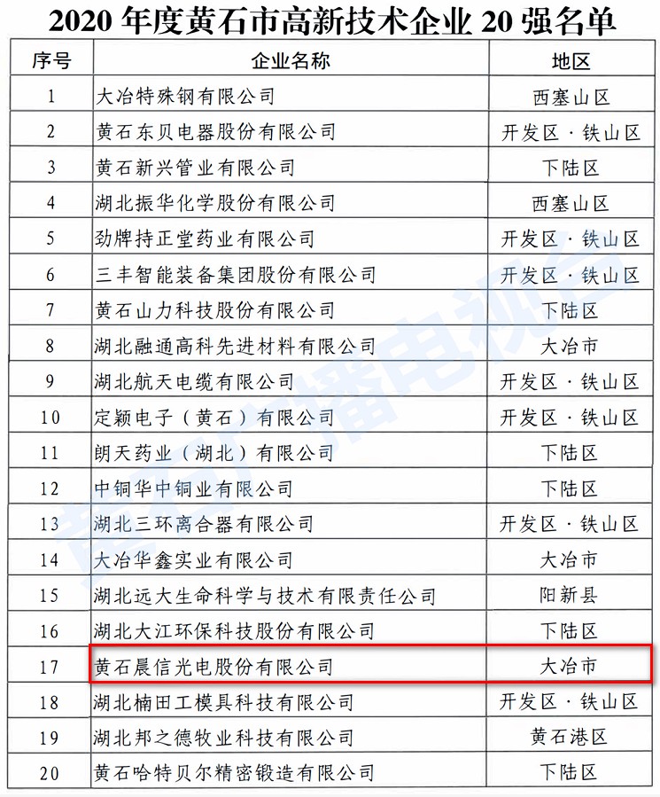 黃石晨信光電股份有限公司榮獲2020年度“黃石市高新技術(shù)企業(yè)20強”